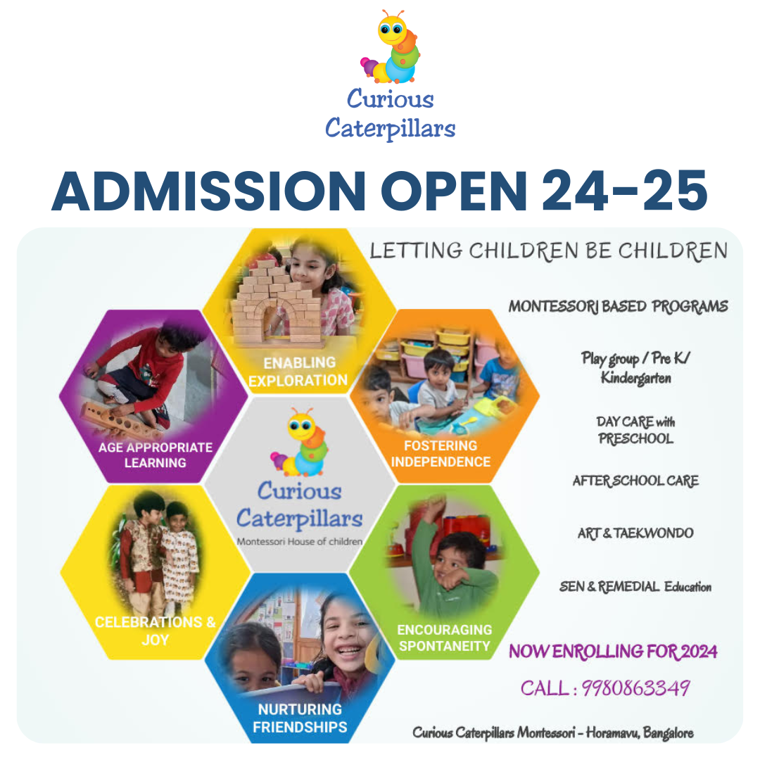 Curious Caterpillars Montessori House is a child centric centre at Bangalore Horamavu. Their preschool services operates from 9.30 am-2.30pm and daycare services operates from 8.30am-6.30pm. The centre is reachable at 9980863349 and shilpa@curiouscaterpillars.in.