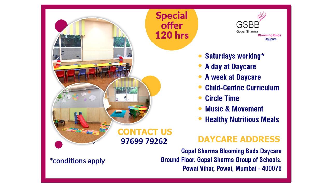 Gsbb Powai Vihar Preschool And Daycare is a child centric centre at Mumbai Powai. Their preschool services operates from 9:00 am to 12:30 pm and daycare services operates from 8:00 am to 8:00 pm ( Monday to Friday) / Saturday (1st and 3rd)- 9:00 am to 1:30 pm. The centre is reachable at 9769979262 and gsbb.daycare@ghpeducations.com.