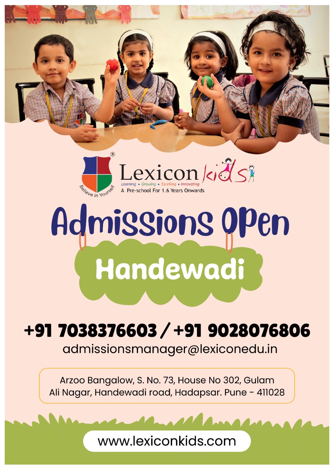 Lexicon Kids Handewadi is a child centric centre at Pune Hadapsar. Their preschool services operates from 9:00 am to 3:00 pm and daycare services operates from 9:00 am to 6:00 pm. The centre is reachable at 7038376603 and admin.kidshandewadi@lexiconedu.in.