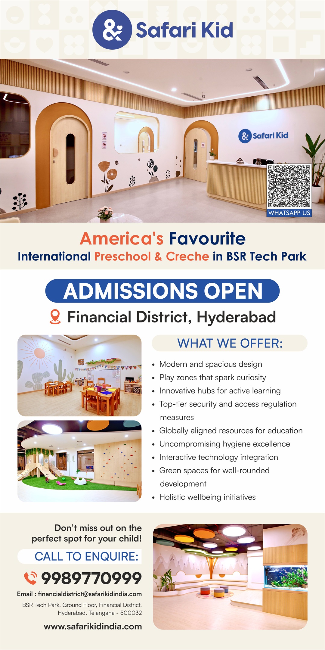 Safari Kid - Bsr Tech Park, Global Preschool & Daycare In Financial District is a child centric centre at Hyderabad Financial-district. Their preschool services operates from 9:00 am - 3:00 pm and daycare services operates from 9:00 am - 6:00 pm. The centre is reachable at 9989770999 and financialdistrict@safarikidindia.com.