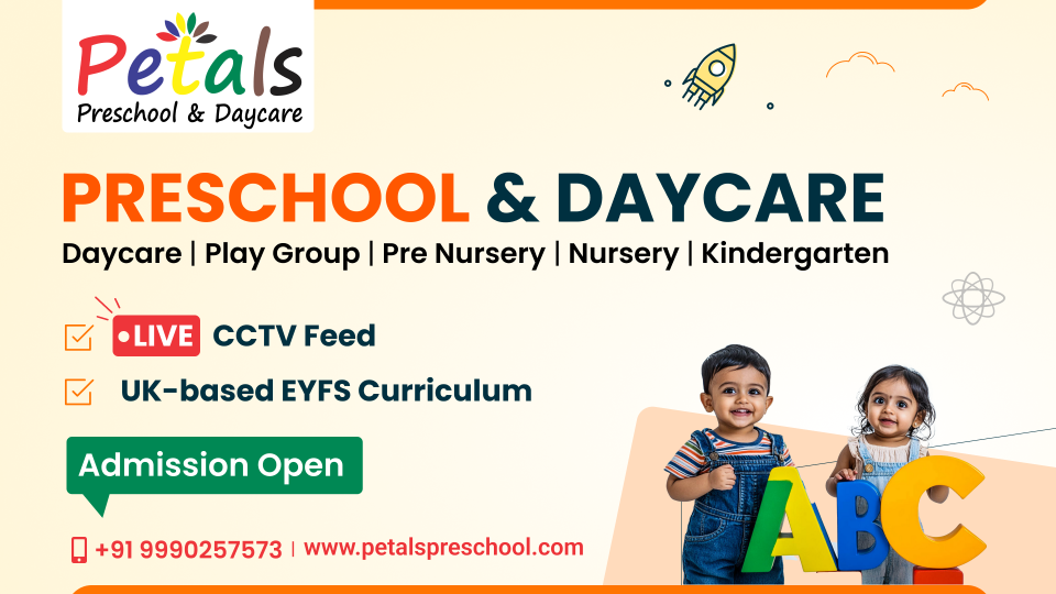Learning Through Joy, Growing Through Play! Petals Preschool & Daycare is a premier preschool in Sector 51 Noida, with a legacy of over 22 years in early childhood education. We are passionate about providing a safe, nurturing, and dynamic environment for your little one. Our specialized programs, including preschool, daycare, after-school care, and mother-toddler programs, focus on your child's holistic development and cognitive growth. What Makes Us Different UK-Based EYFS Curriculum Harvard Research-Based Pedagogy Pause Policy Live CCTV Feed Child Safety and Hygiene SED Connect Brain Aptitude Test Meal Plans by an AIIMS Nutritionist Instant Updates via Parents App Not Satisfied Don't Pay! Join Petals Preschool & Daycare today, where every day is an opportunity for your child to discover, learn, and thrive!
